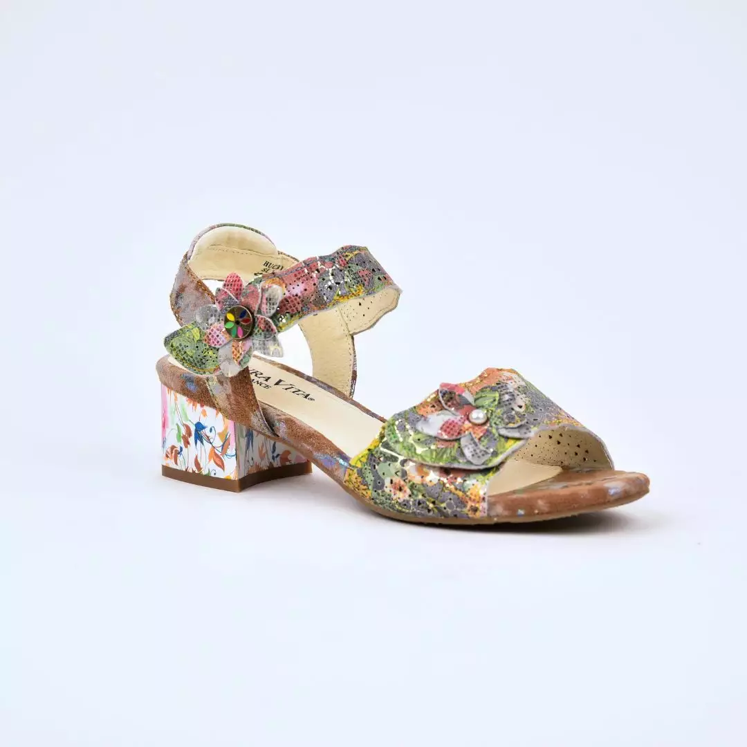 Naisten Laura Vita -sandaalit hurmaavat näyttävällä ja taiteellisella muotoilullaan. Tämä värikäs malli on valmistettu laadukkaasta nahasta, ja sen monivivahteinen pintakuvio yhdistää kukkakuoseja, metallinhohtoisia yksityiskohtia sekä hienovaraisia perforointeja. Säädettävä tarrakiinnitys nilkan kohdalla takaa hyvän istuvuuden ja käyttömukavuuden.