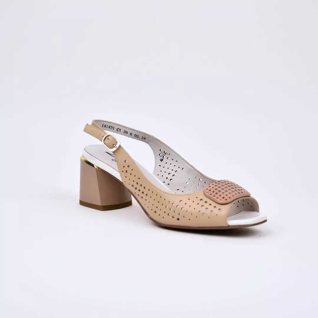 Tämä avokas on valmistettu nahkasta, vuori on nahkaa ja tekonahkaa. Koot 36-41. Väri beige, kauniissa korossa ripaus kultaa. Korko on 6cm ja lesti sopii nomaalille jalalle.
