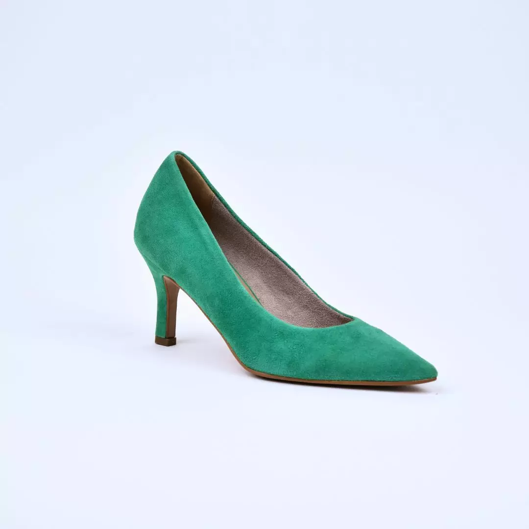 Tyylikkäät Tamaris-avokkaat raikkaassa vihreässä sävyssä. Klassinen, teräväkärkinen malli korostaa jalkaa elegantisti ja sopii niin juhlaan kuin toimistokäyttöön. Pehmeäpintainen päällinen antaa ylellisen ilmeen, ja siro, keskikorkea korko tuo ryhtiä askellukseen säilyttäen käyttömukavuuden. Mukava sisäpohja tukee jalkaa päivän aikana. Materiaali ei ole nahkaa. Erinomainen valinta, kun haluat yhdistää näyttävyyden ja monikäyttöisyyden samaan kenkäpariin.