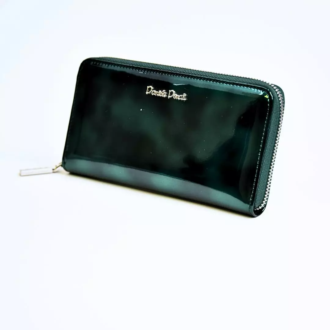 Tämä upea Daniele Donati -lompakko on täydellinen yhdistelmä luksusta ja arjen käytännöllisyyttä. Lompakon upea, syvän tummanvihreä kiiltonahkapinta (patent leather) ja hopeiset yksityiskohdat tekevät siitä todellisen katseenvangitsijan.