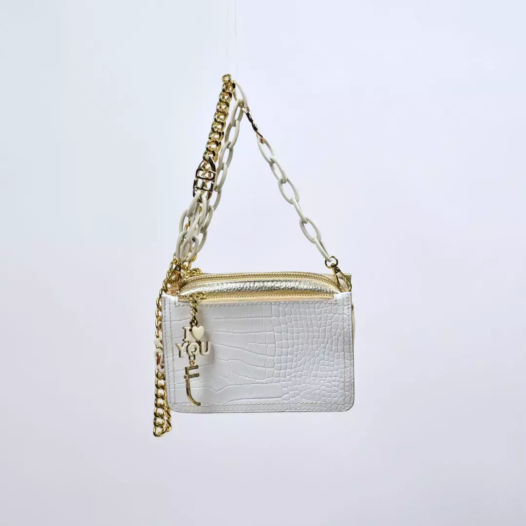 Irrotettava ja säädettävä olkahihna yhdistää näyttävän ketjun ja modernit akryylilenkit, joten laukkua voi käyttää sekä olalla että crossbody-tyylisesti. Täydellinen valinta niin arkeen, juhlaan kuin matkalle, kun haluat yhdistää käytännöllisyyden ja näyttävän italialaisen muotoilun.