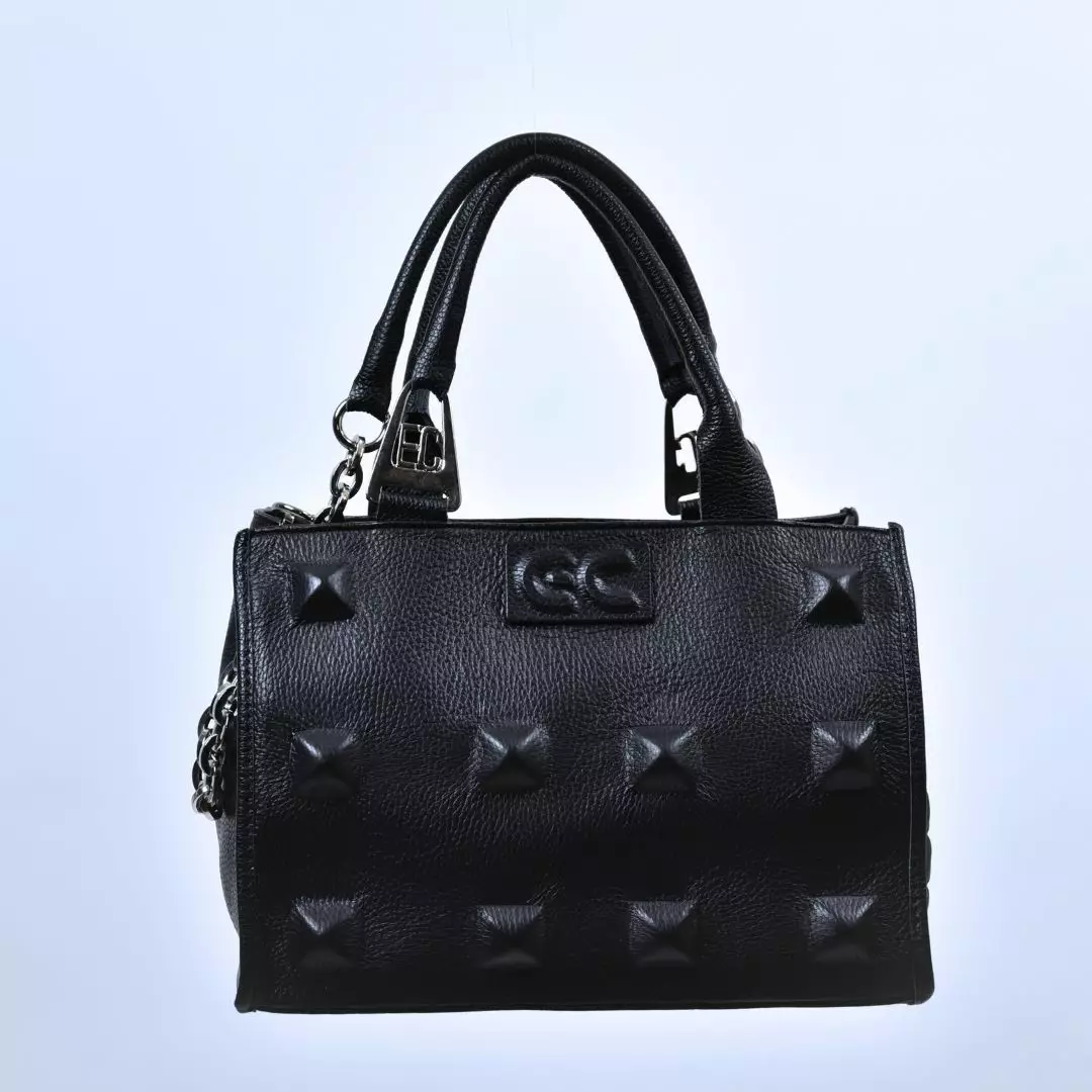 Laukun erikoisuutena ovat näyttävät, kolmiulotteiset koristeniitit, jotka antavat mallille modernin ja hieman rohkean ilmeen. Metalliset yksityiskohdat ja koristeellinen ketju viimeistelevät kokonaisuuden tyylikkäästi ja tuovat siihen ripauksen luksusta.