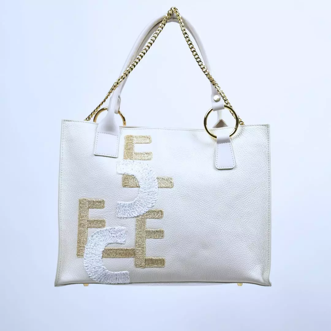 Laukun etupuolta koristaa näyttävä, taidokkaasti kirjailtu kuvio, joka yhdistää neutraaleja sävyjä ja tuo esiin brändin tunnistettavan, taiteellisen kädenjäljen. Kultasävyiset metalliyksityiskohdat ja elegantti ketjukoriste viimeistelevät kokonaisuuden, lisäten siihen ripauksen glamouria ja modernia ilmettä.