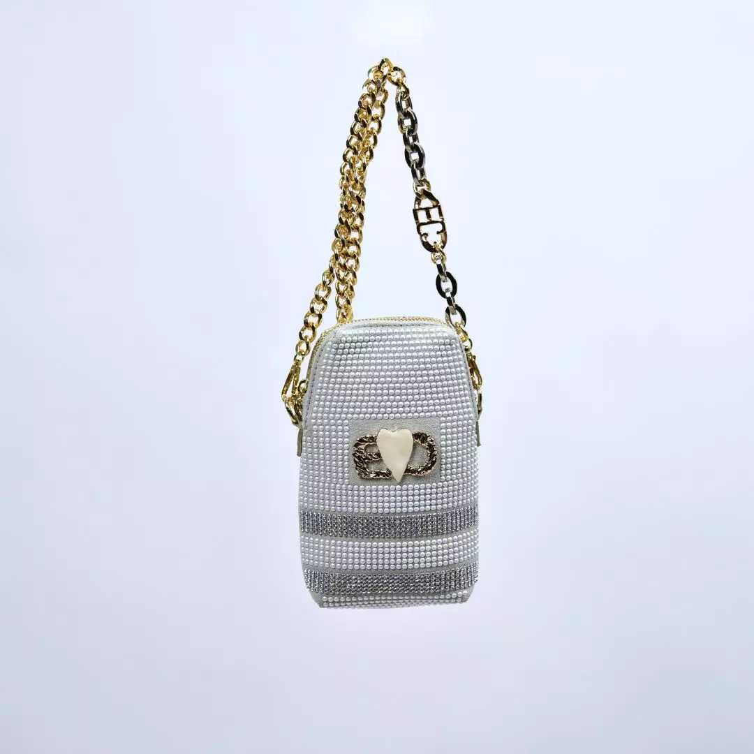 Kädessä ja olkapäällä kannettava minilaukku kultaisella grumettalla.