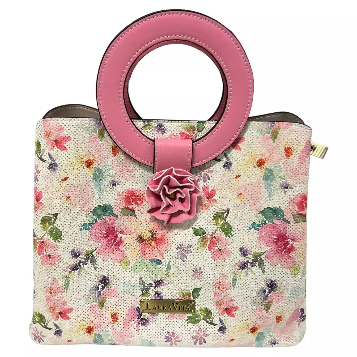 Kaunis ja tilava pieni kukkakuosinen nahkalaukku vaaleanpunaisilla käsikahvoilla ja säädettävällä pitkällä olkahihnalla.