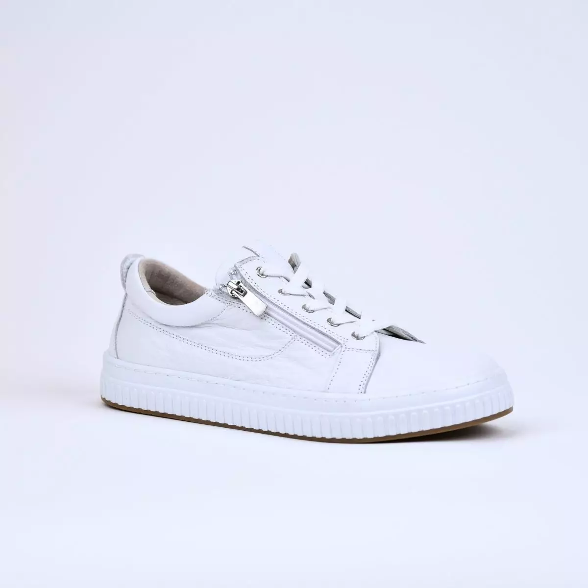 Andrea Conti paljasjalkatyylinen nahkakenkä tarjoaa luonnollisen askelluksen ja erinomaisen käyttömukavuuden. Päällinen on valmistettu pehmeästä vasikannahasta, joka mukautuu jalkaan miellyttävästi. Leveä lesti antaa varpaille tilaa liikkua vapaasti, ja joustava, matalaprofiilinen pohja tukee jalan luonnollista toimintaa. Nauhoituksen ansiosta istuvuus on säädettävissä, ja sivuvetoketju helpottaa pukemista. Irrotettava pohjallinen mahdollistaa omien pohjallisten käytön. Väri: Valkoinen