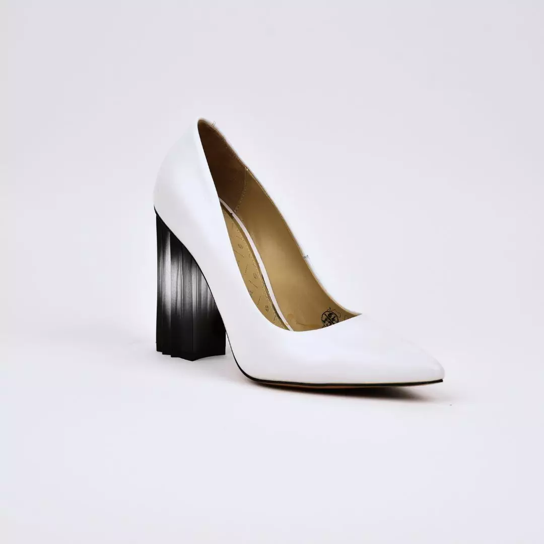 Naisten erittäin kauniit korolliset avokkaat normaalilla lestillä. Kengät valmistettu aidosta nahasta. Valkoiset korkokengät sileää nahkaa ja mustat korkokengät mokkanahkaa. Avokkaissa kannan korkeus on 10,5 cm ja varren korkeus on 7 cm takasaumasta. Näissä juhlakengissä katseenvangitsijana on kannan malli ja muoto.