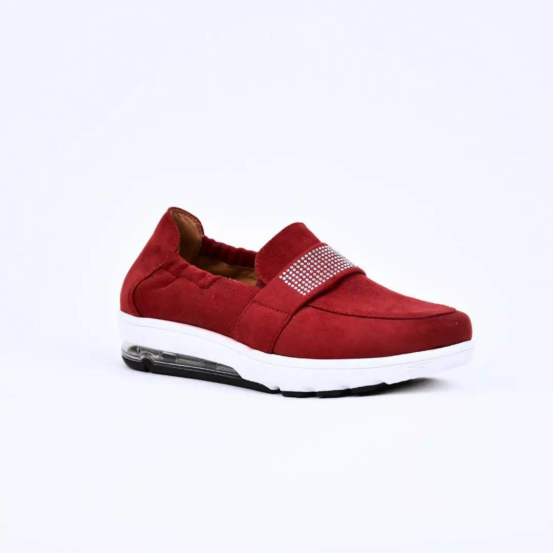 Tyylikkäät ja mukavat punaiset kävelykengät arkeen ja vapaa-aikaan. Pehmeä, joustava päällinen tuntuu miellyttävältä jalassa ja mukautuu hyvin jalan muotoon. Kengän etuosan koristelistassa on näyttävät strassiyksityiskohdat, jotka tuovat ilmeeseen ripauksen säihkettä. Kevyt ja joustava pohja vaimentaa askelta ja tekee kävelystä miellyttävää koko päivän ajan. Normaalilestinen malli istuu useimmille jaloille hyvin. Irrotettava pohjallinen helpottaa puhtaanapitoa ja mahdollistaa omien tukipohjallisten käytön. Kantapään joustava, napakasti istuva materiaali parantaa kengän istuvuutta ja pitää kantapään hyvin paikoillaan ilman liukumista. Erinomainen valinta mukavuutta ja tyylikkyyttä arvostavalle.
