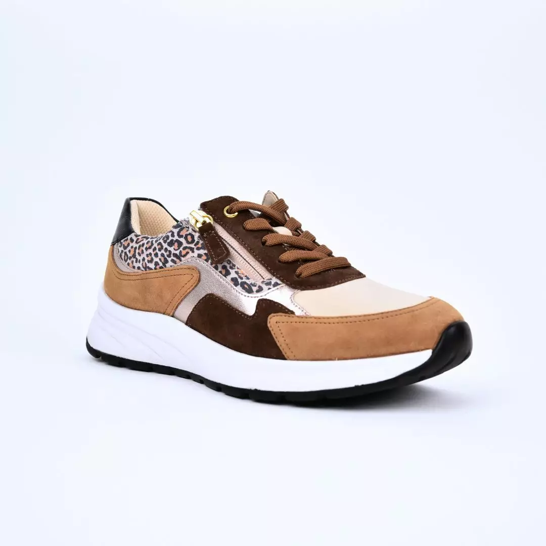 Gaborin modernit sneakerit hurmaavat tyylikkäällä kokonaisuudellaan, jossa lämmin ruskean ja beigen sävymaailma yhdistyy näyttäviin leopardikuvioisiin yksityiskohtiin. Tämä harmoninen mutta persoonallinen design tekee kengistä katseenvangitsijan, joka tuo asuun ripauksen rohkeaa eleganssia ja ajankohtaista ilmettä.