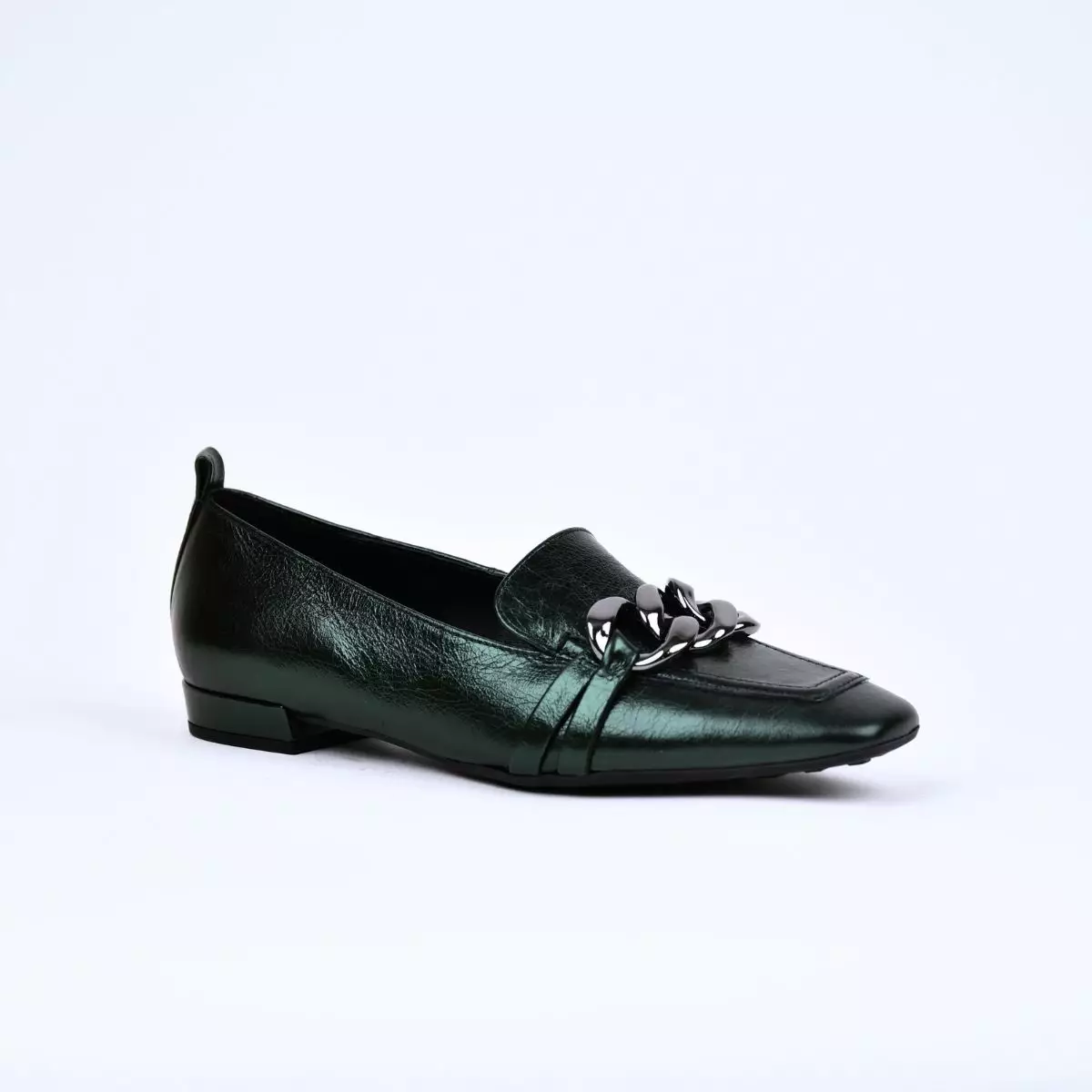 Metallinhohtoiset tummanvihreät loaferit Högliltä. Valmistettu pehmeästä ja ylellisestä karitsannahasta. Päällä metallinen koriste. Nämä ajattomat loaferit sopivat erinomaisesti vaikka töihin ja ne on helppo yhdistää niin housuihin kuin mekkoihinkin.