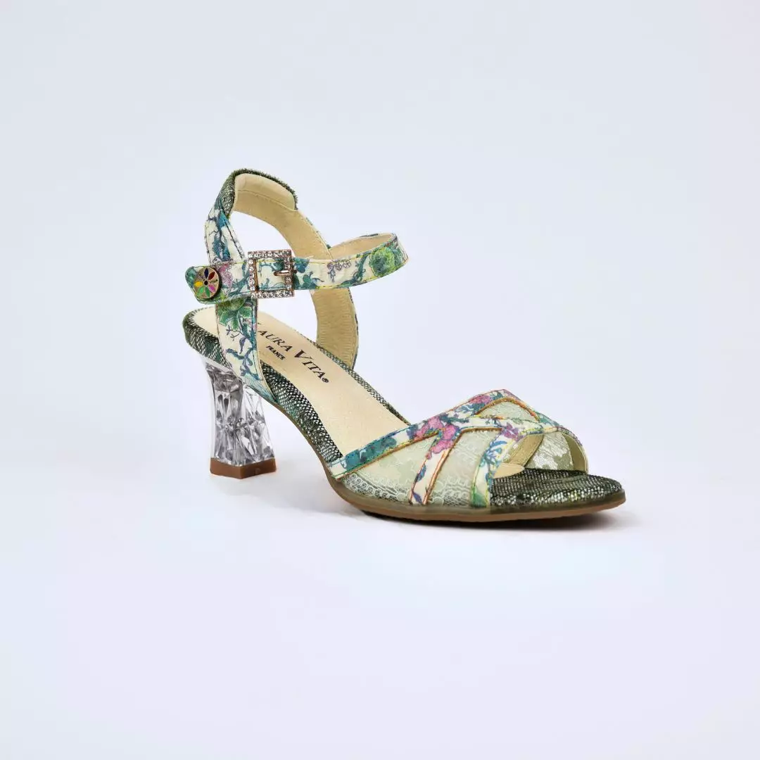 Tyylikkäät ja persoonalliset Laura Vita -sandaalit viimeistelevät kesäisen asukokonaisuuden näyttävästi. Monivärinen, kukkakuvioitu tekstiili yhdistyy kauniisti vihreän sävyihin ja hienostuneisiin yksityiskohtiin. Säädettävä nilkkaremmi soljella takaa hyvän istuvuuden ja käyttömukavuuden. Pehmeä sisäpohja tuntuu miellyttävältä jalassa, ja tukeva, koristeellinen korko läpinäkyvällä rakenteella tuo kenkiin modernia ilmettä ja vakautta kävelyyn. Täydellinen valinta juhliin, kesätapahtumiin tai näyttäväksi arkeen.