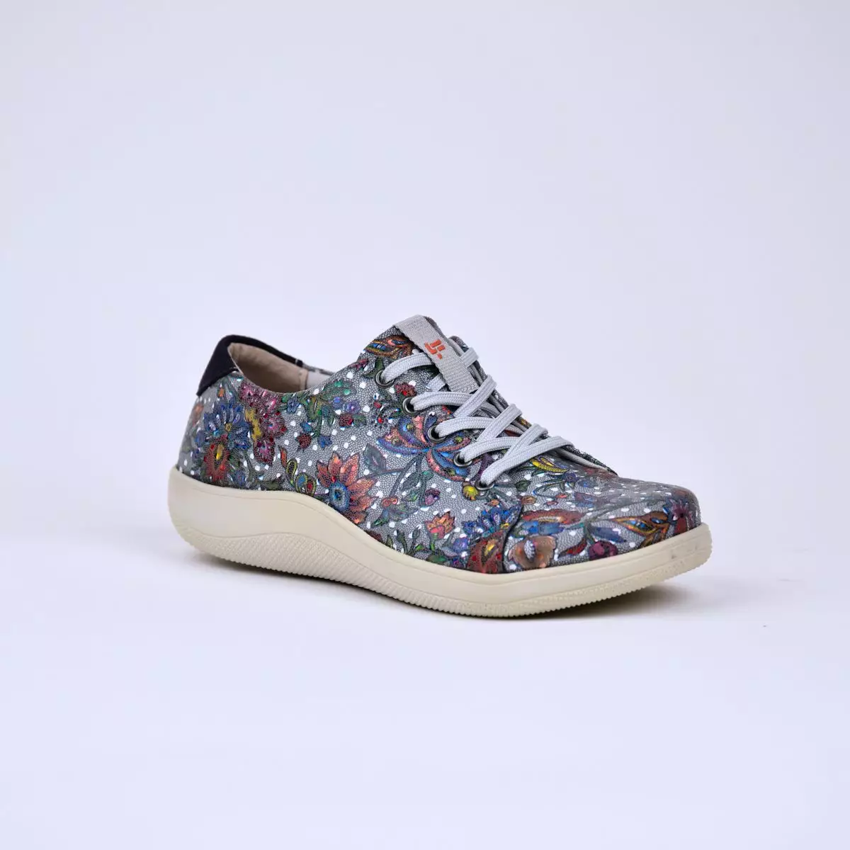 LYFIT-Taylor on näyttävä ja mukava vapaa-ajan kenkä, joka yhdistää ergonomian ja persoonallisen muotoilun. Kengän monivärinen kukkakuvioitu pinta tuo asuun raikkautta ja yksilöllisyyttä, kun taas hillitty harmaa pohjasävy tekee kokonaisuudesta helposti yhdisteltävän. Pehmeä Stretch System -rakenne mukautuu jalan muotoon ja lisää käyttömukavuutta koko päivän ajaksi. Nauhakiinnitys takaa hyvän istuvuuden, ja kevyt, joustava ulkopohja vaimentaa askelta. LYFIT-Taylor sopii erinomaisesti arkeen, kävelyyn ja vapaa-aikaan, kun haluat yhdistää tyylin ja mukavuuden.