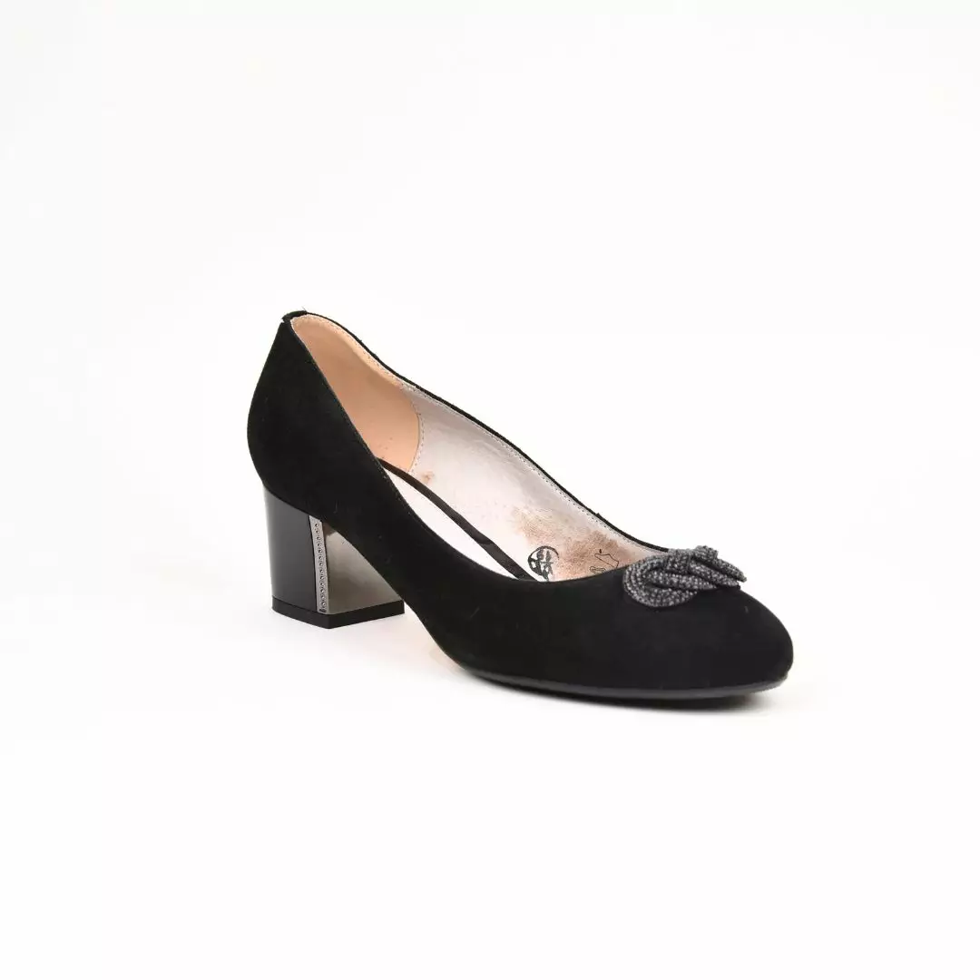 Naisten mustat avokkaat leveällä lestillä, joissa yhdistyvät mukavuus ja ajaton tyylikkyys. Kengät on valmistettu pehmeäpintaisesta materiaalista, joka tuntuu miellyttävältä jalassa ja mukautuu hyvin jalan muotoon. Pyöristetty kärki sekä matala, tukeva korko lisäävät käyttömukavuutta koko päivän ajaksi. Kärjen näyttävä strassikoriste tuo kenkään eleganttia juhlavuutta. Erinomainen valinta työkäyttöön, juhliin ja muihin tilaisuuksiin, kun arvostat sekä tilavuutta että huoliteltua ulkonäköä.