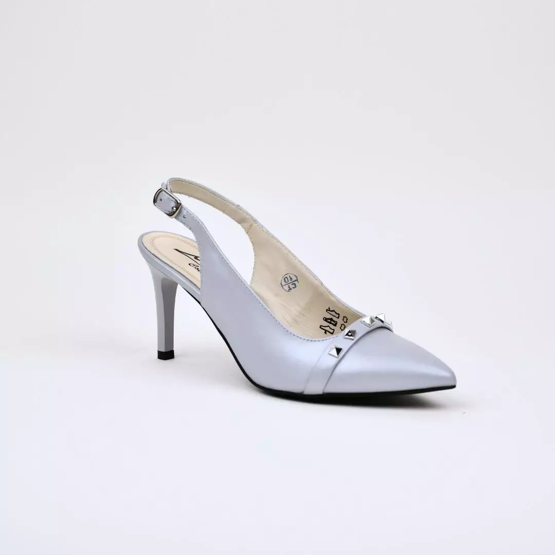 Tämä avokas on valmistettu nahkasta, myös vuori on nahkaa. Koot 36-41. Väreinä helmiäishohtoiset vaalea beige ja harmaa, katseenvangitsijana kärjessä niittikoristeet. Korko on 8cm ja lesti sopii kapealle ja normaalille jalalle.