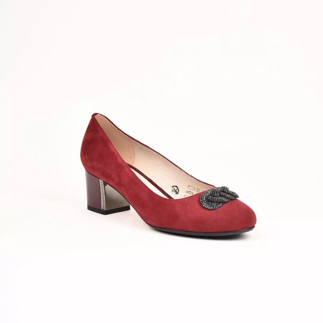 Avokas on valmistettu mokkanahasta, myös sisävuori on nahkaa. Väreinä musta ja viininpunainen, yksityiskohtana kaunis koriste jalkapöydän päällä. Lesti on XXL, joten sopii leveälle jalalle. Pehmustettu sisäpohja lisää käyttömukavuutta. Koot 35-41. Tukeva korko 5cm kauniilla kuvioinnilla.