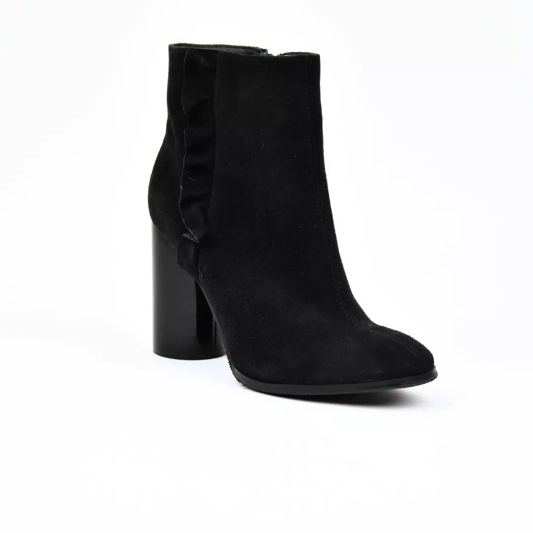 Tyylikkäät ja ajattomat mokkanahkaiset nilkkurit ovat täydellinen valinta niin arkeen kuin juhlavampiin hetkiin. Pehmeä mokkanahkapinta antaa kengille ylellisen ilmeen ja miellyttävän tuntuman jalassa. Nilkkapituinen varsi istuu kauniisti jalkaan ja takana oleva rypytetty yksityiskohta tuo malliin hienostunutta näyttävyyttä. Sisäsivun vetoketju helpottaa pukemista. Tukeva, kiiltävä tolppakorko lisää ryhtiä ja antaa vakautta kävellessä. Monikäyttöinen musta väri on helppo yhdistää erilaisiin asukokonaisuuksiin vuoden ympäri.