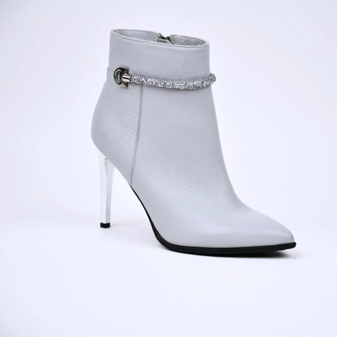 Naisten kauniit harmaat piikkikorolliset nilkkurit normaalilla lestillä. Nilkkurit valmistettu aidosta nahasta ja niissä on tekstiilivuori. Kengissä kannan korkeus on 10 cm ja varren korkeus on 11 cm takasaumasta. Sisäsivulla vetoketju. Edessä nilkan kohdalla kaunis somiste.