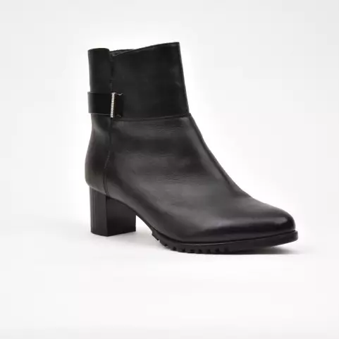 Naisten nahkaiset talvikengät normaalin kokoisella lestillä ja turkisvuorella. Kengät sopivat sekä arkeen että juhlaan. Pohjat ovat pitävät liukkaalla talvikelillä. Sisäsivulla on vetoketju ja kenkää koristelee kaunis solki. Kannan korkeus on 5,5 cm ja varren korkeus on 14 cm takasaumasta.