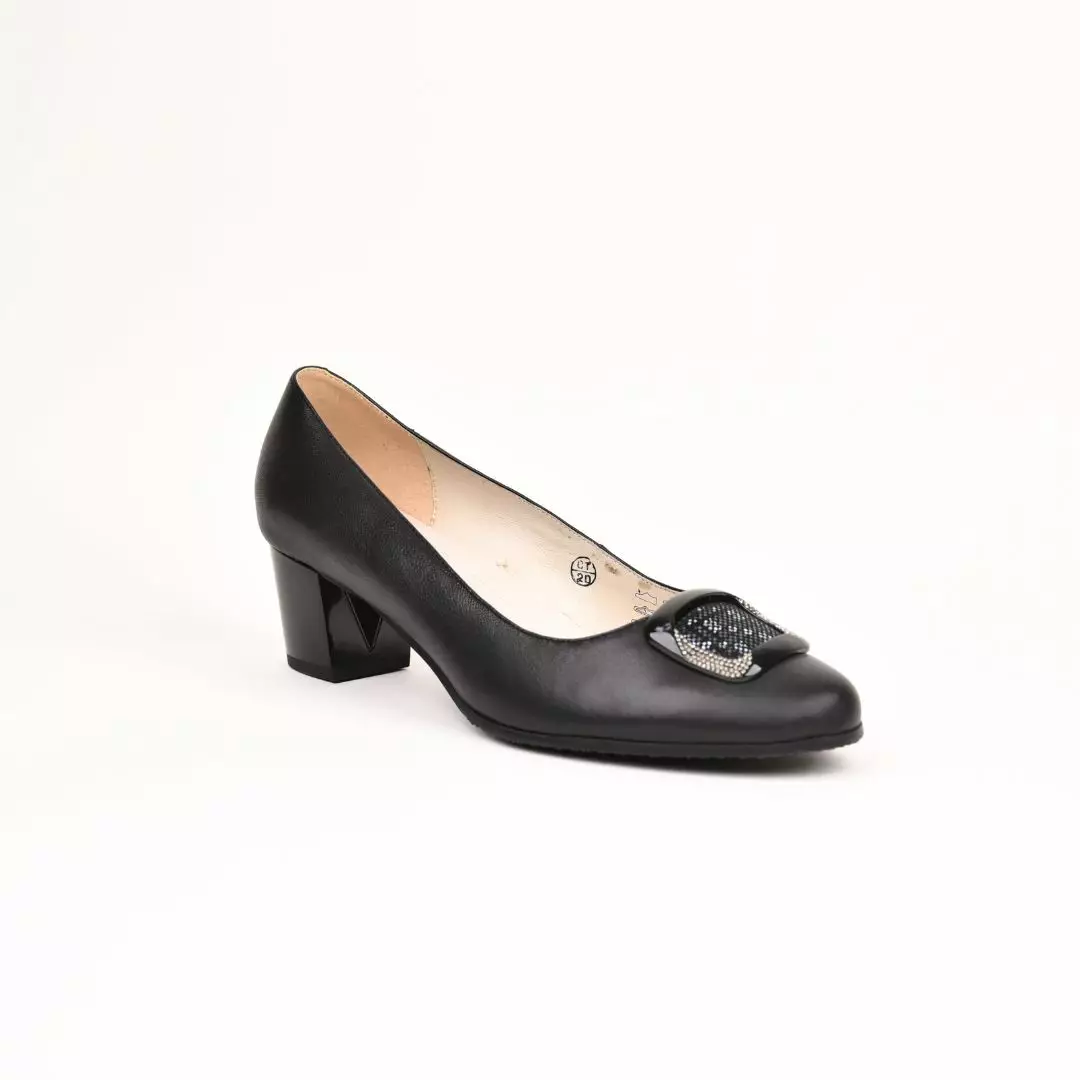 Avokas on valmistettu nahasta, myös sisävuori on nahkaa. Värinä sileänahkainen ja mokkanahkainen musta, kärjessä kaunis koriste. Lesti on XXL, joten sopii leveälle jalalle. Pehmustettu sisäpohja lisää käyttömukavuutta. Koot 36-44. Tukeva korko 5cm.