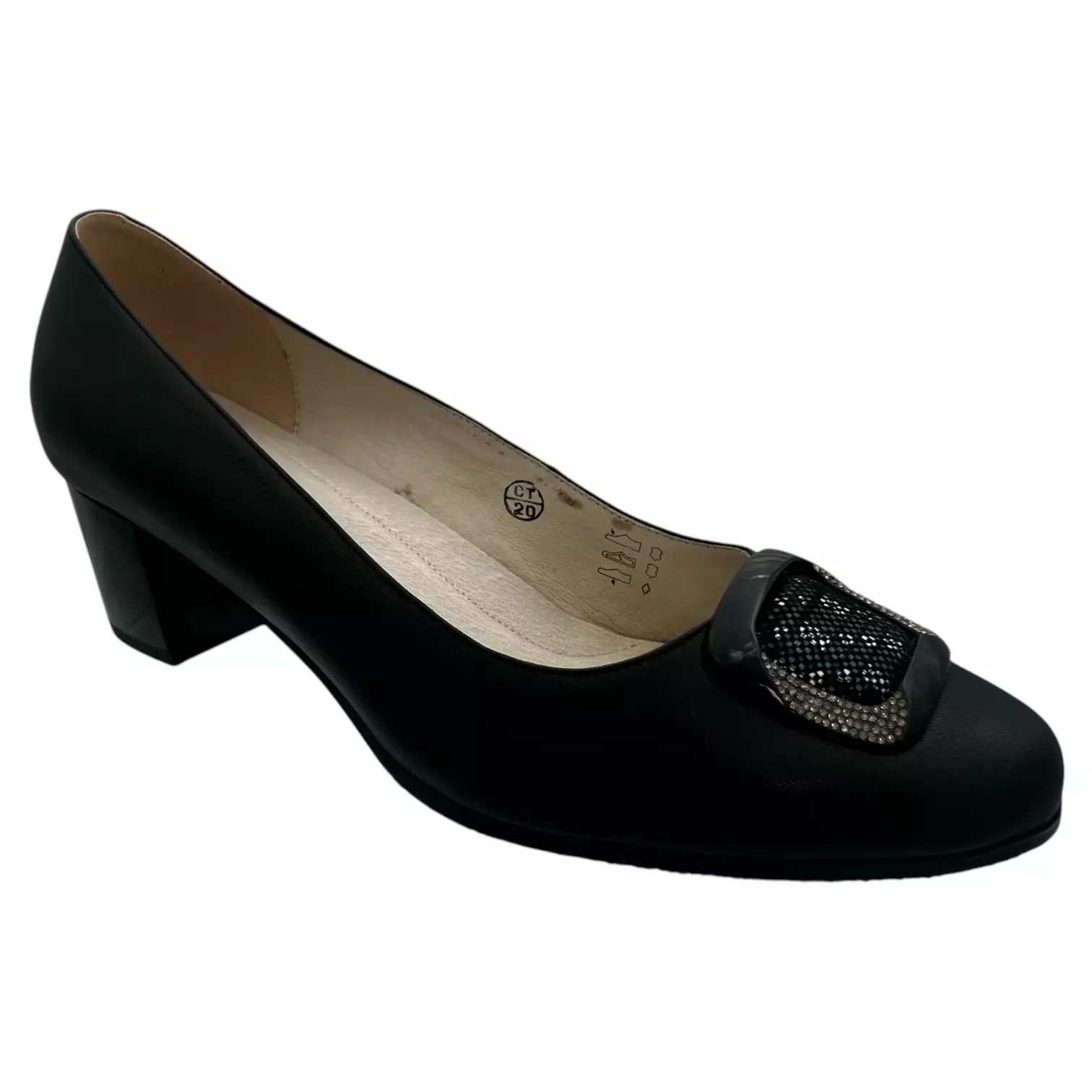 Avokas on valmistettu nahasta, myös sisävuori on nahkaa. Värinä sileänahkainen ja mokkanahkainen musta, kärjessä kaunis koriste. Lesti on XXL, joten sopii leveälle jalalle. Pehmustettu sisäpohja lisää käyttömukavuutta. Koot 36-44. Tukeva korko 5cm.