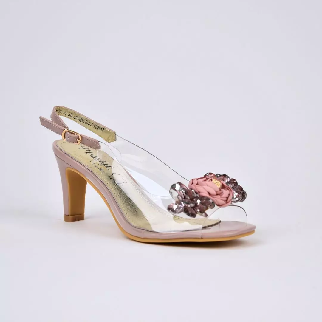 Läpinäkyvä sivuosa tekee mallista kevyen ja modernin näköisen, samalla kun kultasävyinen sisäpohja lisää hienostunutta viimeistelyä. Säädettävä nilkkaremmi soljella takaa hyvän istuvuuden ja mukavuuden. Keskikorkea korko antaa ryhtiä askellukseen, mutta pysyy silti miellyttävänä käytössä.