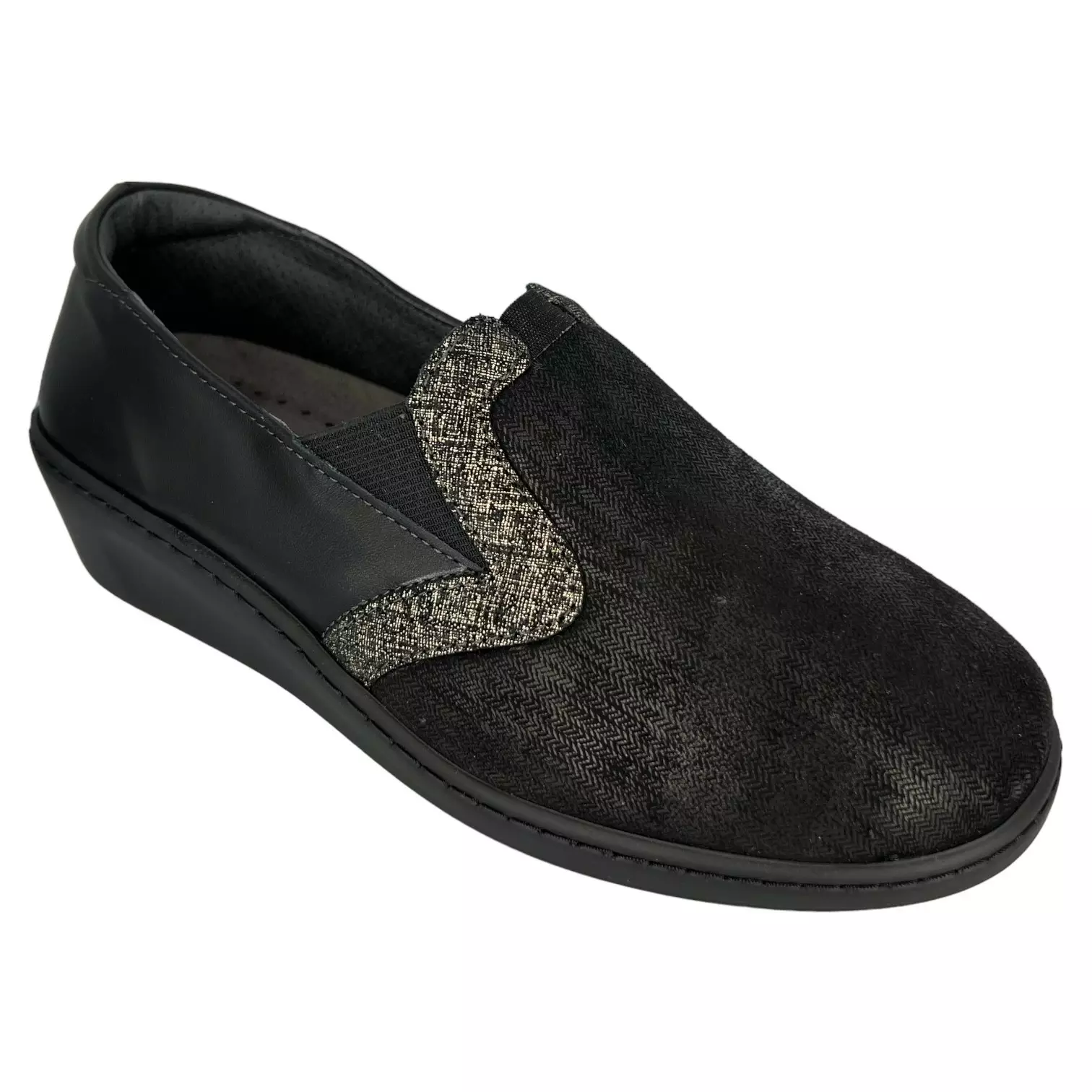 PODOWELL Stelly Kävelykengät Musta Tekstiili Kiiltävän mustan reunan ansiosta naisellinen ja elegantti kenkä, joustimet kengän päälliosan sivuissa helpottavat pukemista. Mokasiiniksi ilman nauhoja tai vetoketjuja on erittäin helppo pukea, jalan etuosa on erittäin joustava ja mukautuu hyvin jalkaan. Sen joustava kangas jalkaterässä ja sen saumaton vuori tarjoavat erinomaisen mukavuuden turvonneille ja herkille jaloille. Ulkopohja on erittäin kevyt, joustava, vakaa ja luistamaton. Hikoilua ja kostumista estävä ja antibakteerinen OnSteam® -vuori mahdollistaa miellyttävän ja hygieenisen käytön. Sopii hyvin vaivasenluun, Quintus varus, kynsi- tai vasaravarpaan omaaviin jalkoihin.