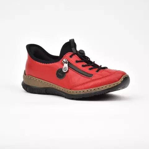 Rieker vapaa-ajankengät erittäin pehmeällä Rieker Soft sisäpohjallisella. Helposti jalkaan puettava malli Ready2Go kovetetun kantakapin ansiosta et tarvitsee enää kenkälusikkaa vaan jalat sujahtavat kenkiin aivan kuin itsestään. Kengässä on myös pikakiristys ja nauhat ovat hyvin elastiset. Ulkopohjat ovat pitävää TR-kumia. Soveltuvat hyvin vaikka työkäyttöön kuten monet ovat tehneet. Malli on lestiltään normaalia.