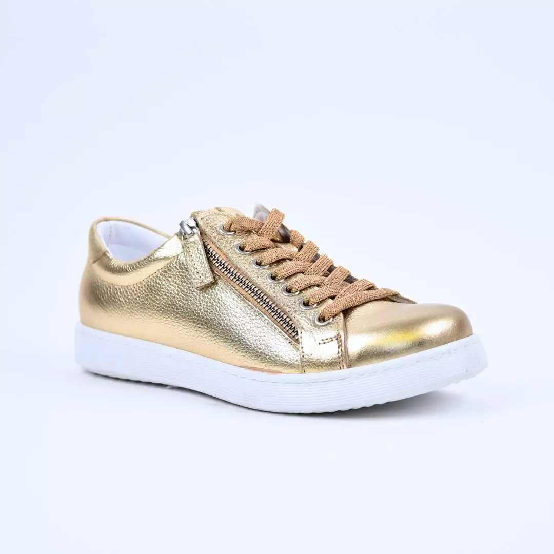 Andrea Contin tyylikkäät nahkatennarit tuovat arkeen ripauksen ylellisyyttä ja modernia ilmettä. Kauniisti hohtava kullan sävy tekee kengistä näyttävät mutta silti helposti yhdisteltävät niin rentoon kuin huolitellumpaankin asuun.