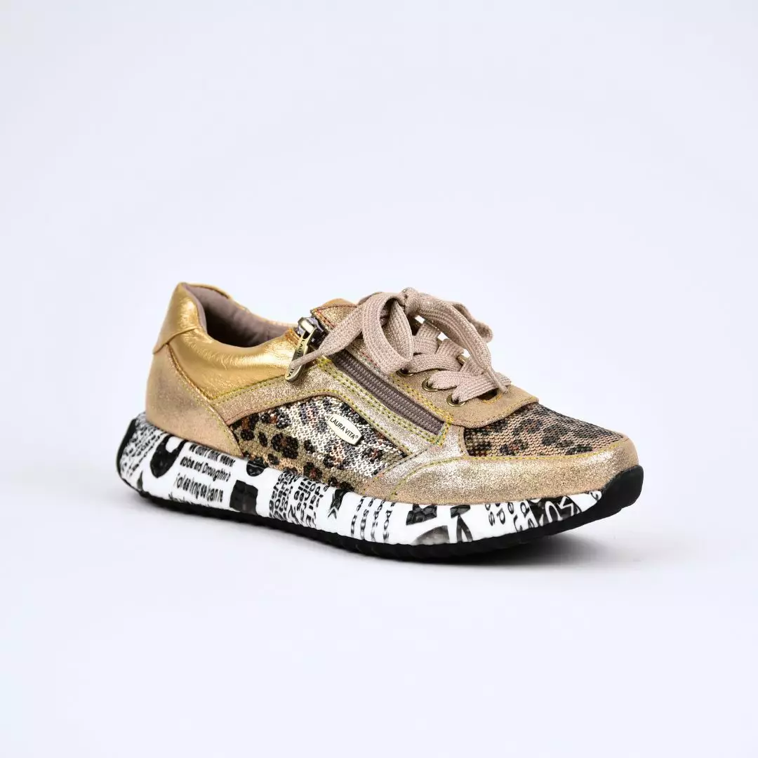 Tyylikkäät ja persoonalliset Laura Vita -kengät tuovat asuun näyttävyyttä ja mukavuutta. Näissä kengissä on kaunis kullan sävyinen pinta, joka yhdistyy näyttäviin leopardikuvioisiin paljetteihin ja kimalteleviin yksityiskohtiin. Sivussa oleva vetoketju helpottaa pukemista, ja nauhat mahdollistavat hyvän istuvuuden säätämisen. Mallissa on leveä lesti, joten se sopii hyvin myös hieman leveämmälle jalalle. Irrotettava pohjallinen lisää käyttömukavuutta ja mahdollistaa myös omien tukipohjallisten käytön. Kevyt ja joustava pohja tekee kengistä miellyttävät käyttää koko päivän. Erinomainen valinta, kun haluat yhdistää mukavuuden, laadun ja rohkean tyylin.